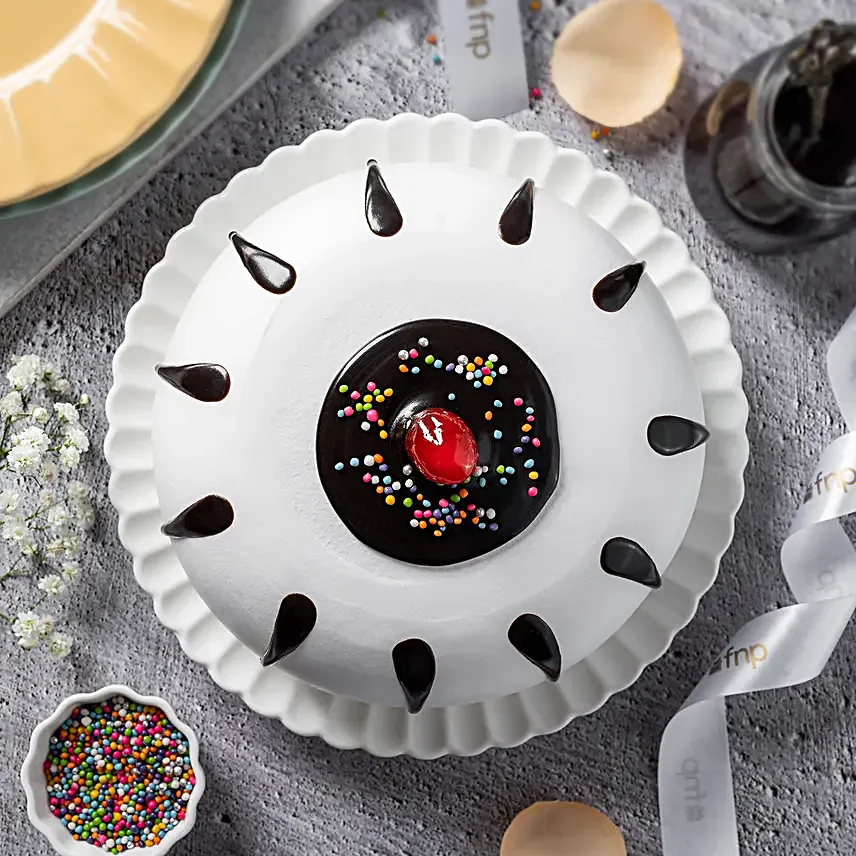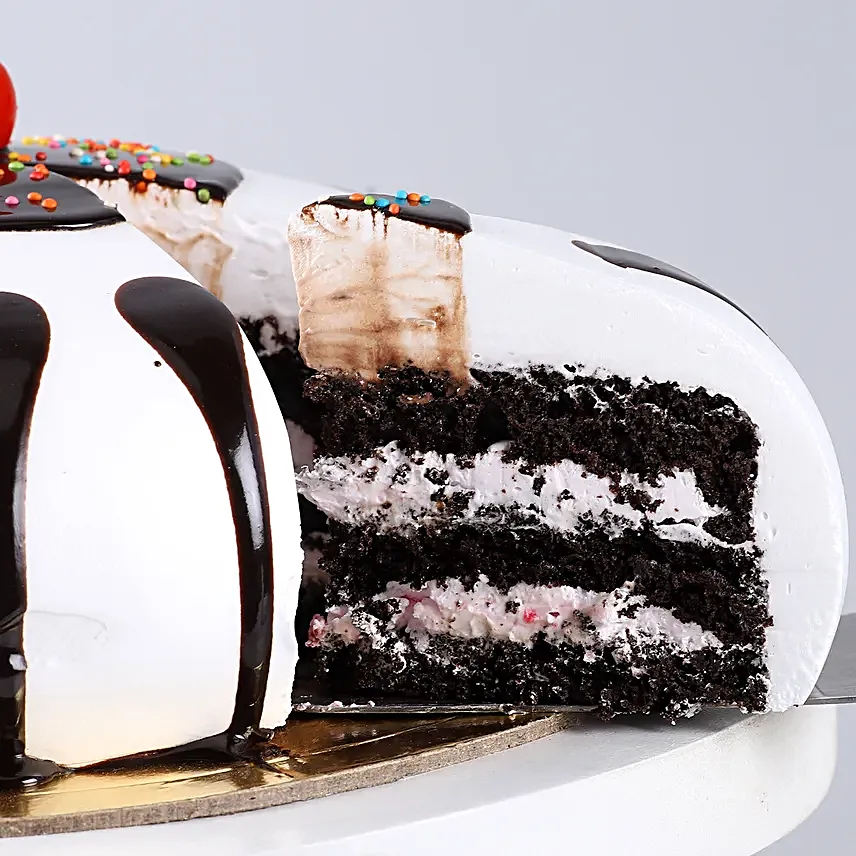 Dressed in silky white cream and drizzled with rich chocolate ganache, this dome-shaped Black Forest beauty surprises with moist chocolate sponge and layers of luscious whipped cream. Crowned with a cherry and colorful sprinkles, it’s a festive treat for birthdays, celebrations, or just because.
