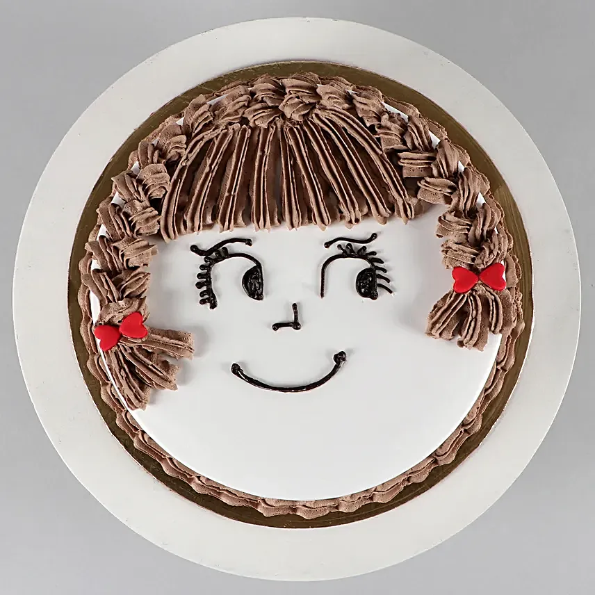 Add a dose of charm to any celebration with this delightful half-kg chocolate cake! Designed with a cute girl face, complete with chocolate cream hair styled in braids and topped with red edible bows, it’s impossible not to smile back. Underneath the charming design lies a rich, moist chocolate sponge layered with silky chocolate cream. Perfect for birthdays, kids' parties, or simply spreading some joy—this cake brings smiles and sweetness in every bite.