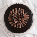This round-shaped chocolate truffle cake is topped with layers of rich ganache and beautifully arranged chocolate rolls. Every bite is soft, moist, and packed with deep cocoa flavor — making it the perfect centerpiece for any celebration!
