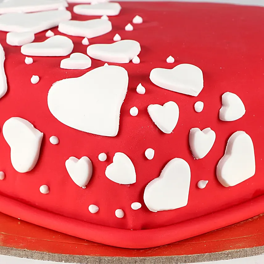 Dressed in rich red fondant and decorated with cascading white hearts, this 1kg heart-shaped truffle cake is a celebration of pure affection. With its smooth finish and elegant design, it's the perfect centerpiece for anniversaries, Valentine's Day, or sweet romantic surprises that speak straight to the heart.